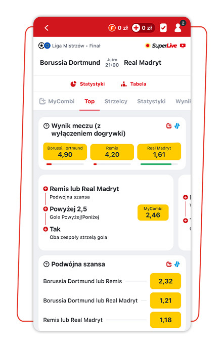 - Zakłady łączone (np. wynik/liczba goli poniżej/powyżej),